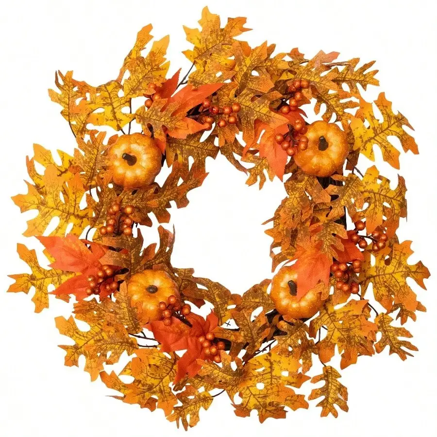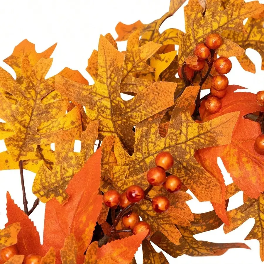 This beautiful Autumn leaves artificial Thanksgiving wreath is adding a of warmth and charm to your home this holiday seasonThis wreath features a gorgeous array of autumnal foliage, including vibrant leaves, plump pumpkins, and luscious berries, all expertly crafted a lifelike appearancewreath is unlit, allowing you to customize it with your own lights or decorations, and is easy to hang on any door, wall, or window with its sturdy backingProduct Features: Unlit Yellow and orange leaves fall wreathDecorated with a variety of autumn-themed items such as leaves, pumpkins, and berriesNo assembly required – wreath comes in 1 piece Natural circular twig backing easy hangingRecommended indoor use or covered outdoor useDimensions: 22" diameter (measured from outermost to outermost across wreath) Inner diameter: 9" Depth: 5" Material(s) twig/foam/plastic/fabric