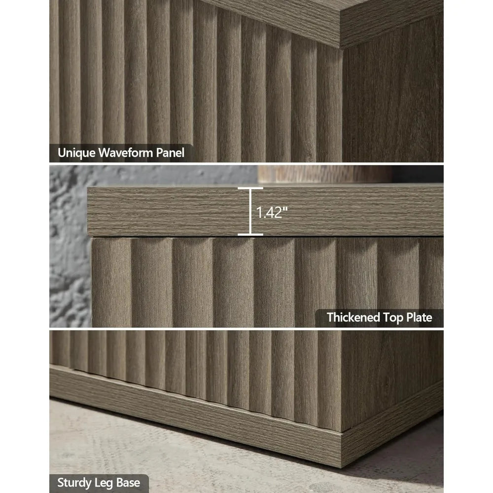- 【Minimalist & Practical】- The storage cabinet boasts a minimalist profile and doors with a unique waveform panel, setting it apart from ordinary furniture pieces. Equipped with pop-up design doors that offer easy access to stored items while maintaining a sleek and seamless appearance. This distinctive design adds a touch of sophistication and style to your living space, enhancing the overall aesthetic appeal of your home decor.