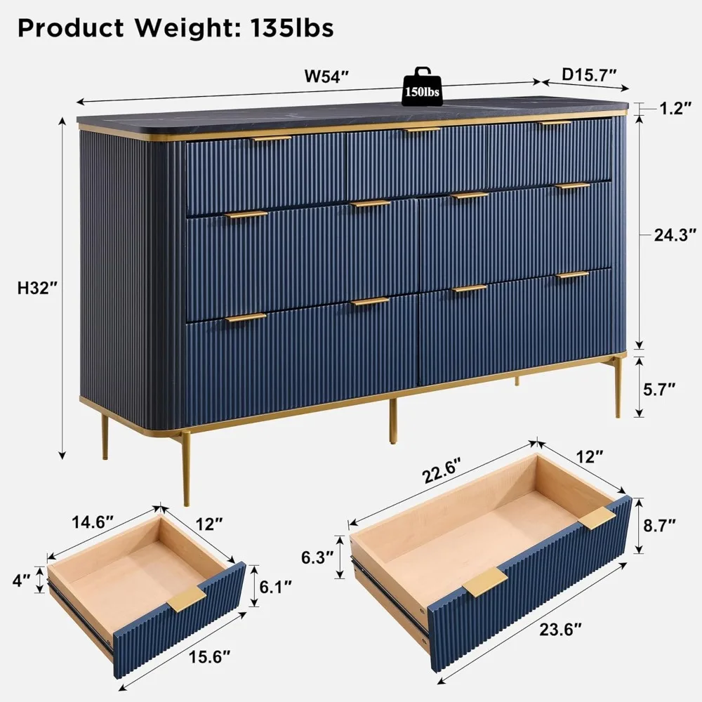 Fluted 7 Drawers Dresser for Bedroom, 54" Wide Modern Dresser TV Stand, Gold Accents, Fluted Fronts, Wood Storage Dressers Orga