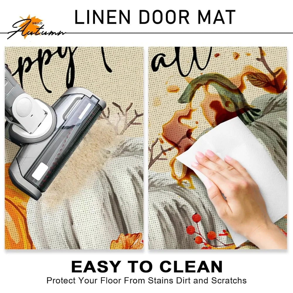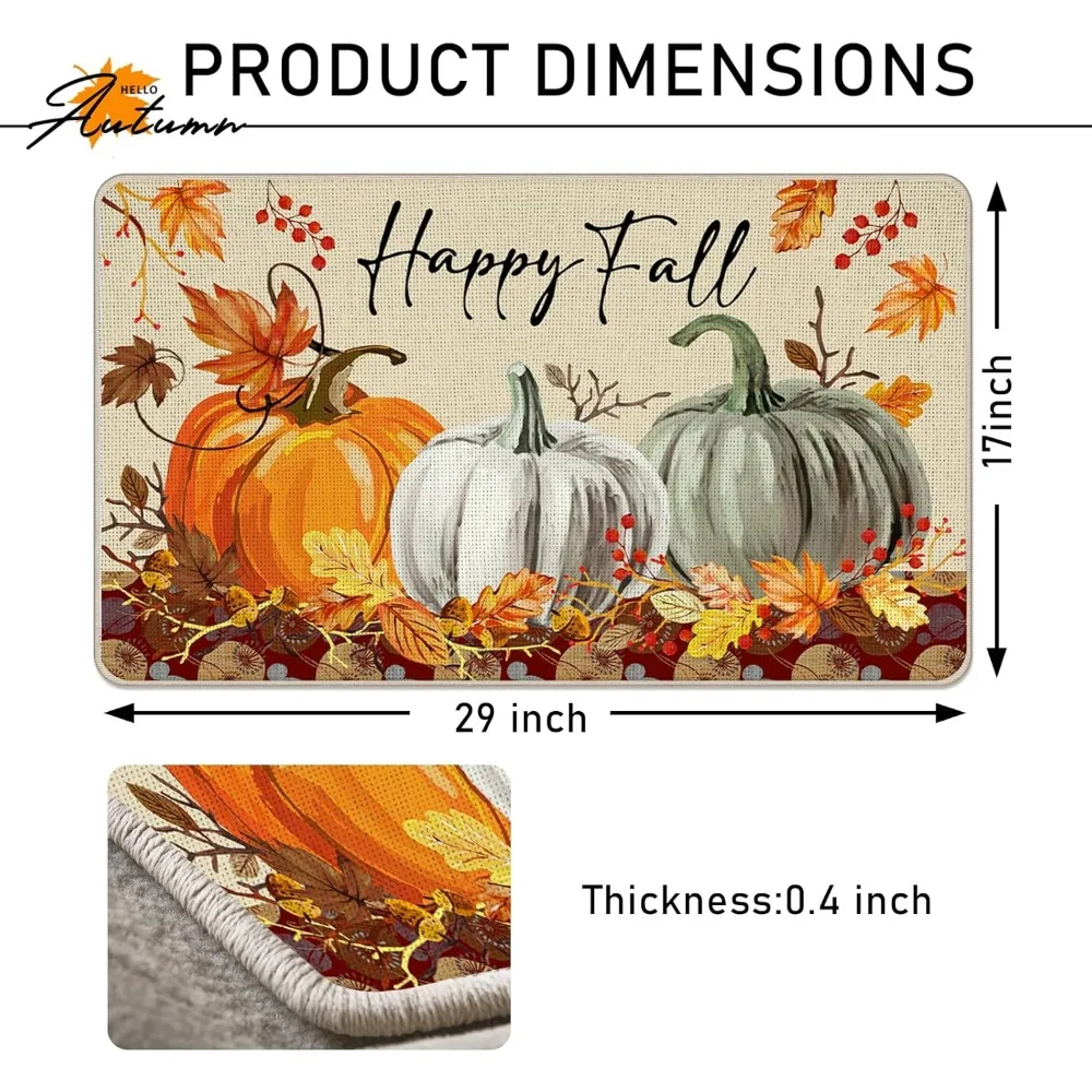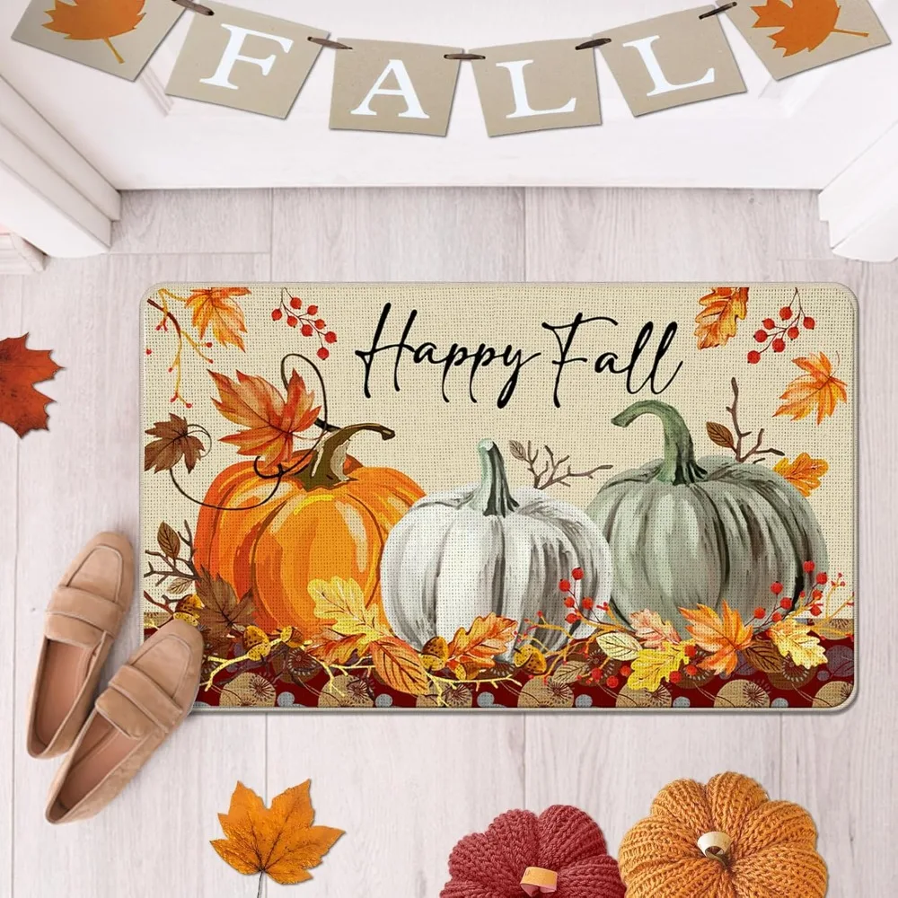 happy fall pumpkin decorative front door mat, autumn maple leaves welcome doormat indoor outdoor non-slip floor entryway rug, th