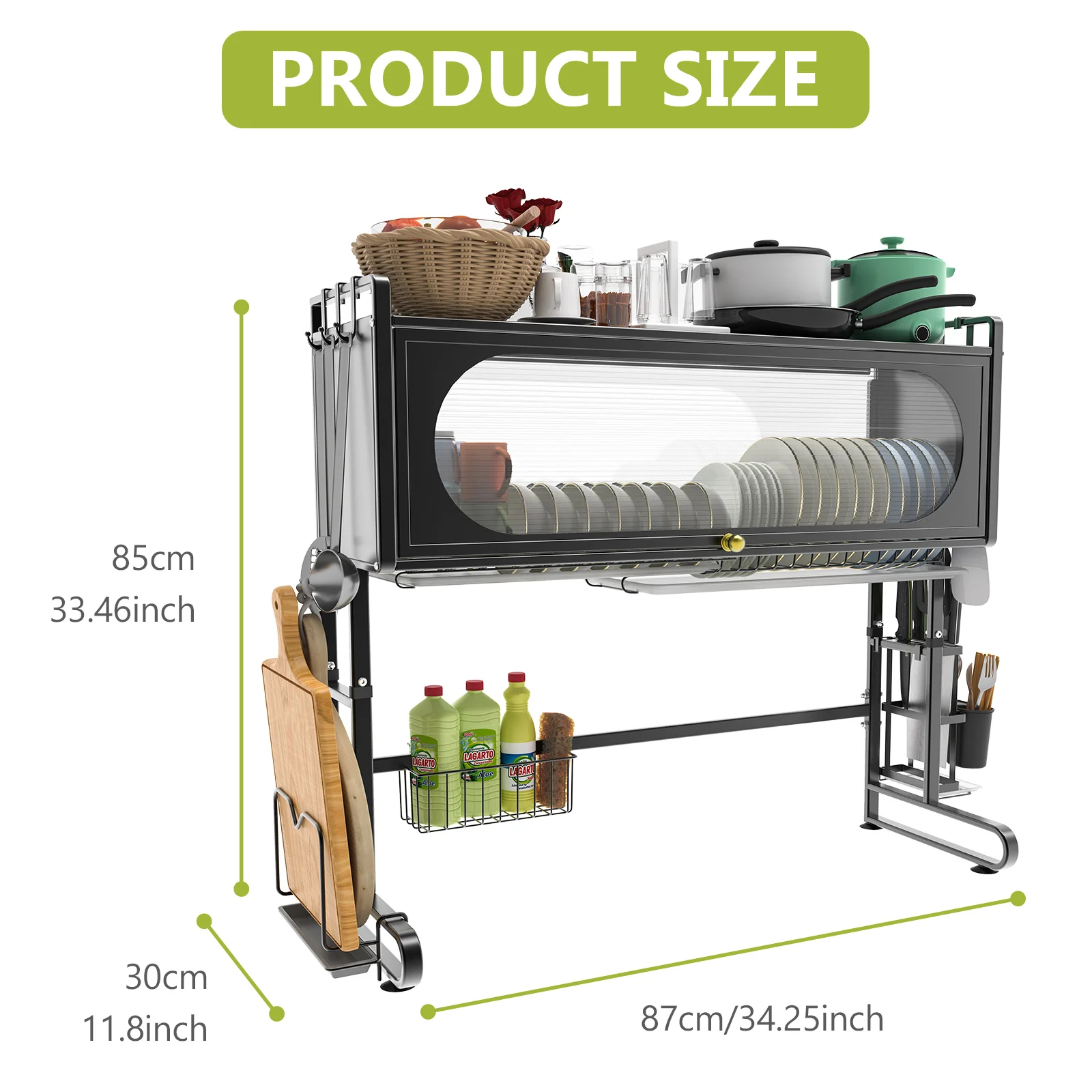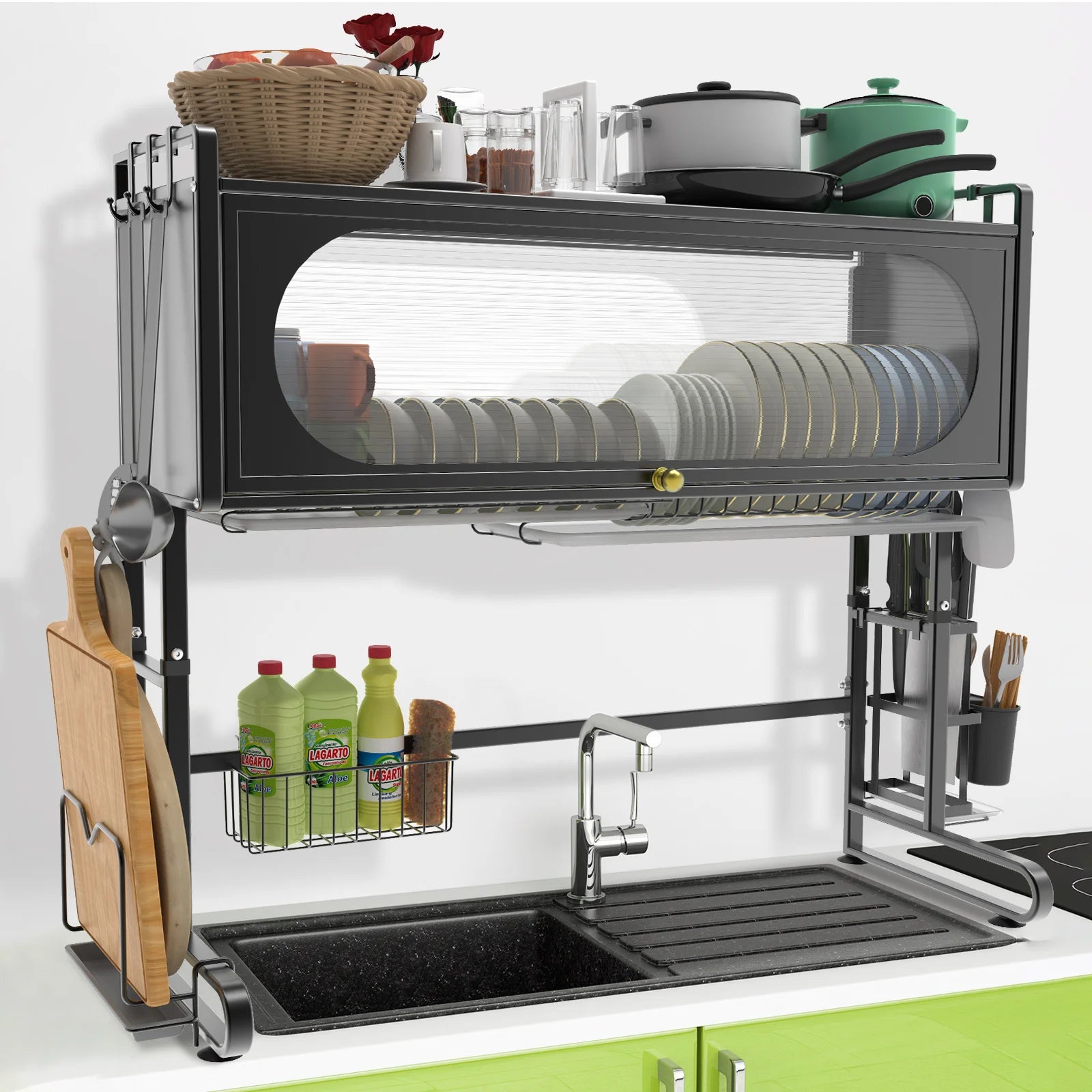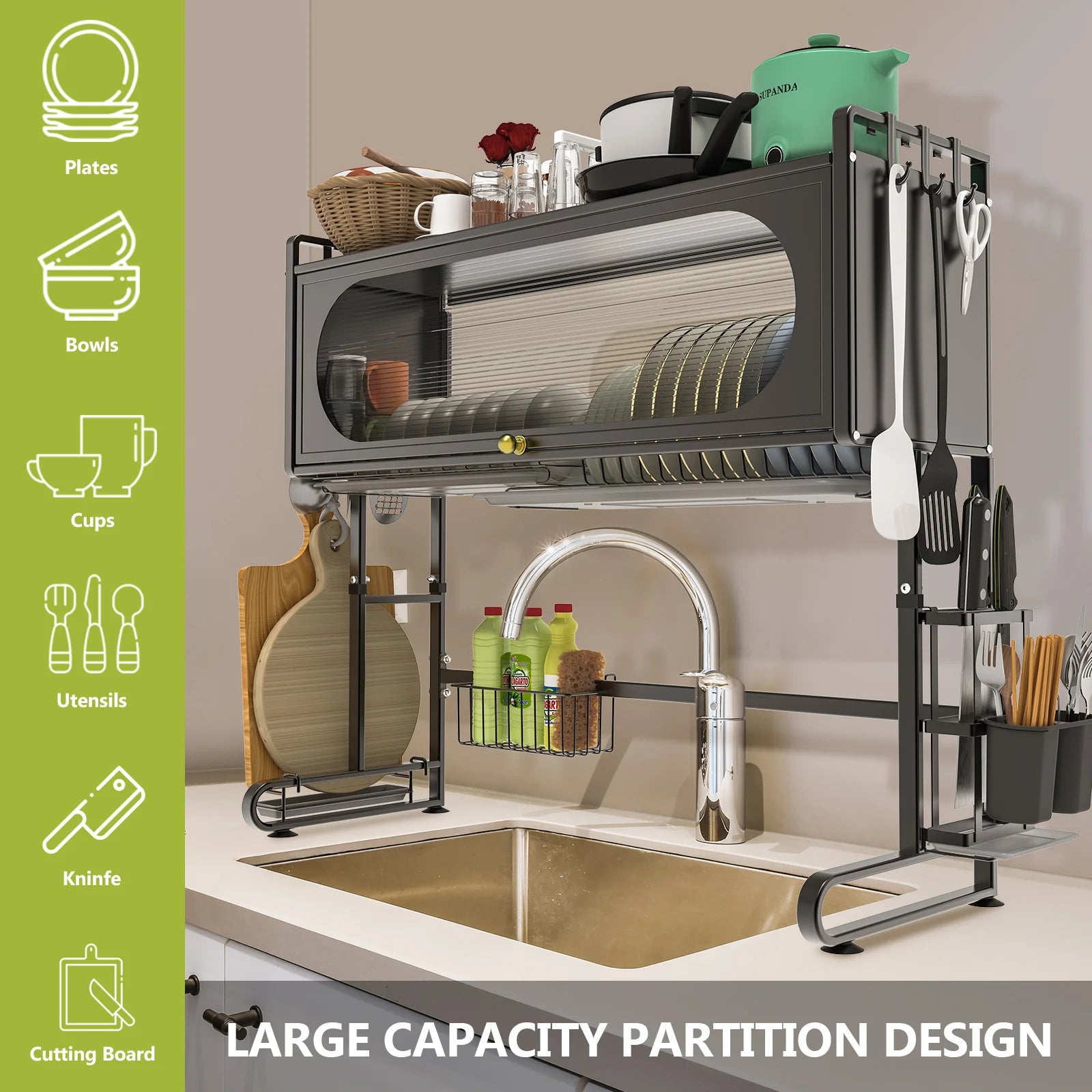 This sink storage rack features an egg-shaped outline with a transparent water wave-patterned panel, offering both aesthetic appeal and dust protection, adding an artistic touch to your kitchen. The 90° flip-open cabinet door design easily blocks dust and grease, making it convenient to access items. The raised guardrails and side knife holder ensure that kitchen essentials are safely and securely stored. The unique pull-out draining tray and hollow design help keep your countertop dry and clean, while also being easy to maintain. The suction cup feet provide stability and prevent slipping, adding extra safety to your kitchen. Its easy-to-assemble design requires no tools, includes all necessary parts, and the draining rack is detachable for cleaning. With its versatile functionality, it fits various sink sizes and accommodates a wide range of kitchen essentials, making it the perfect choice for both small and large kitchens.