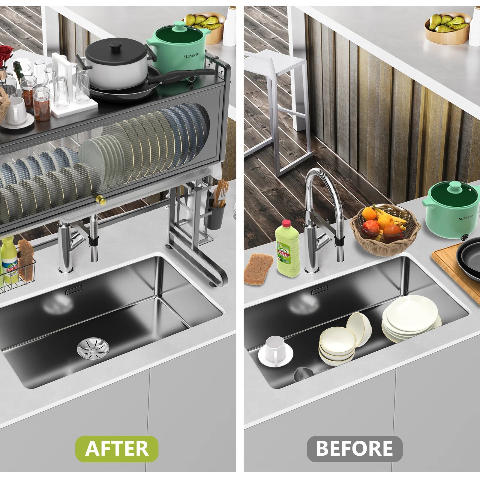 【Pull-Out Draining Tray with Hollow Design】The unique pull-out draining tray design lets you quickly drain water from dishes and kitchenware, collecting water in the tray to prevent wetness and pooling on the countertop. The hollow design of the rack makes daily cleaning and maintenance a breeze.