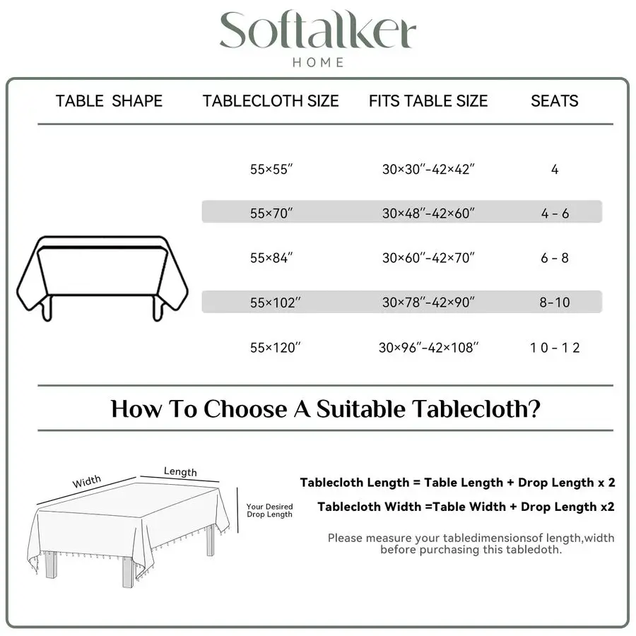 SIZE CHOICES Each package includes 1 tablecloth measuring 55 W by 102 L. The tablecloth is typically larger than your table size, so it39s recommended to add at least 20 inches to the length of your table 10 inches on each side for a better drape effect.